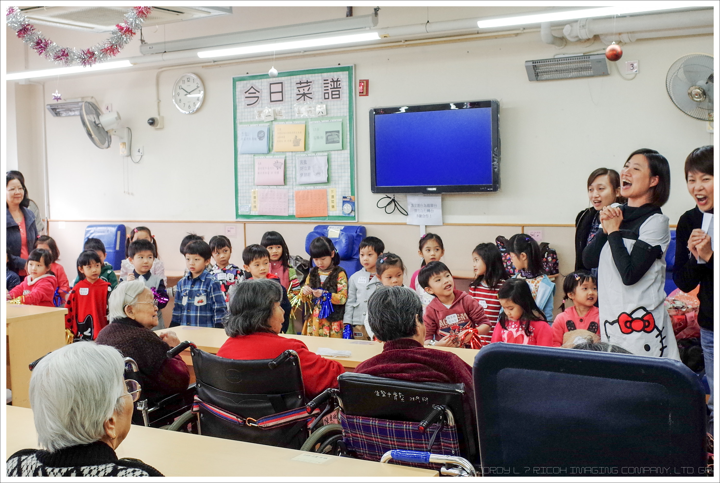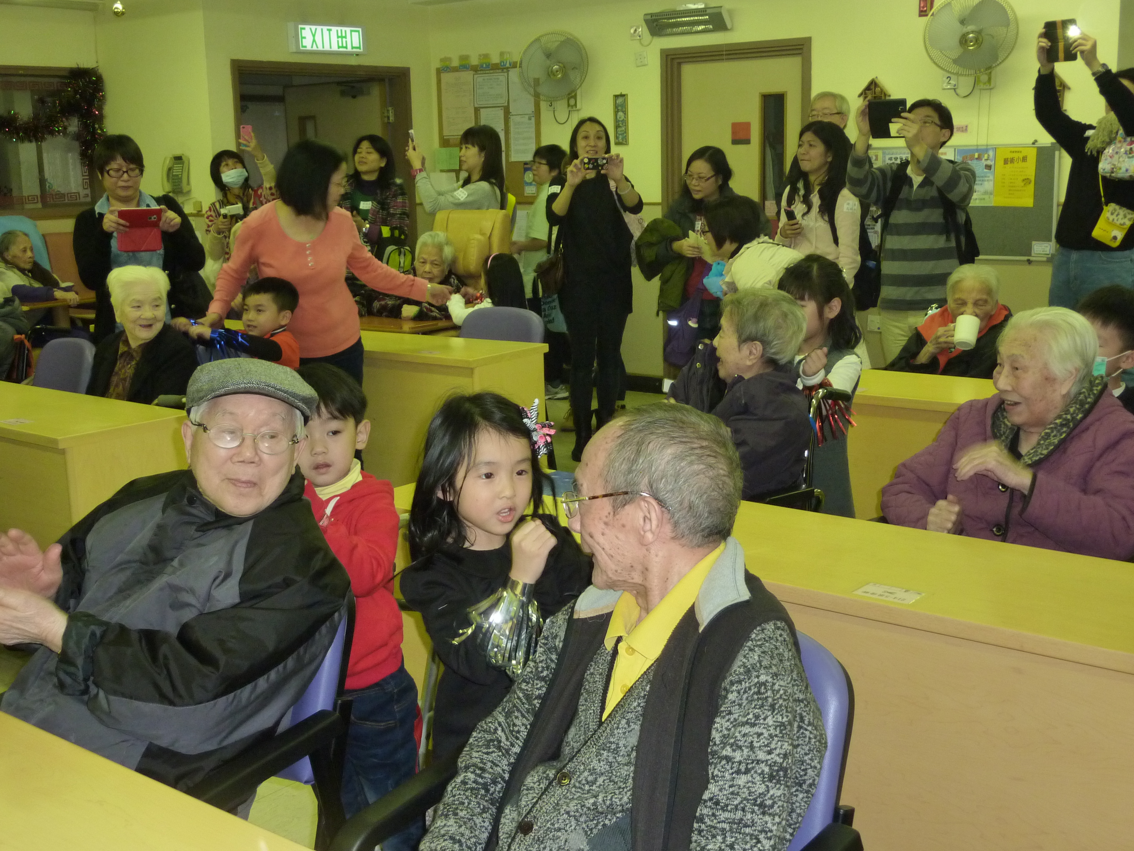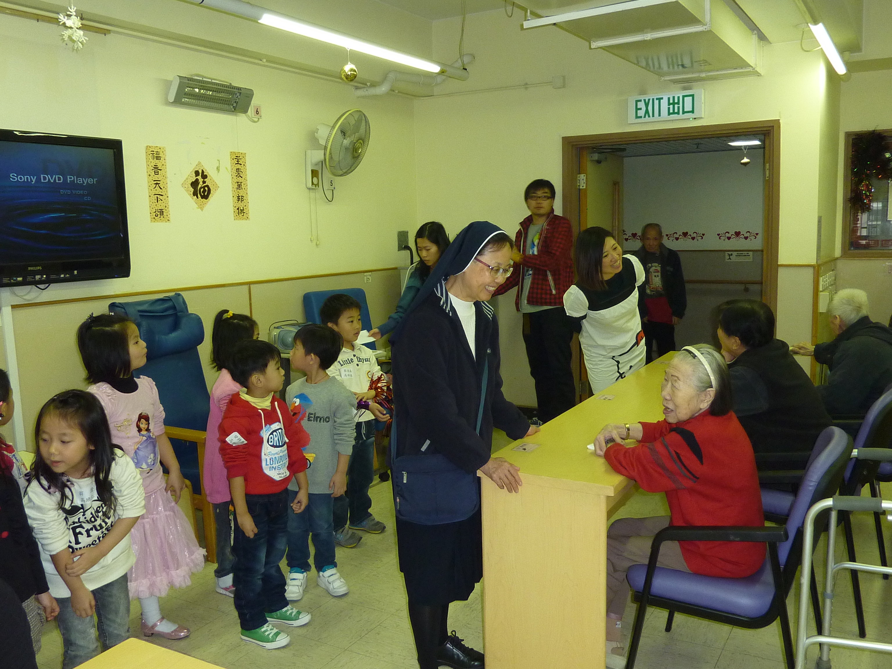 2014年1月4日,家教會與本園宗教組合辦「家校同心表關懷~親子探訪護老院」活動。我們分上、下午班到香港西營盤明愛恩翠苑。由司儀彭麗儀老師、謝凱琪老師及家教會委員洪美玉女士一起帶領小朋友頌唱~讚美主、天父我愛你及耶穌喜愛小孩等歌曲來感謝天主。熱身表演後,孩子們開始蹦蹦跳地表演活力健康操,盡顯個人活力。小朋友透過「敲咚咚」音樂替公公婆婆們搥骨,場面十分溫馨。彭主任和老師們也帶動全場齊做「十巧操」。最後是「金馬傳愛心」,家長和孩子一起送每位長者一份「愛心禮物」,讓公公、婆婆感受我們對他的關懷。