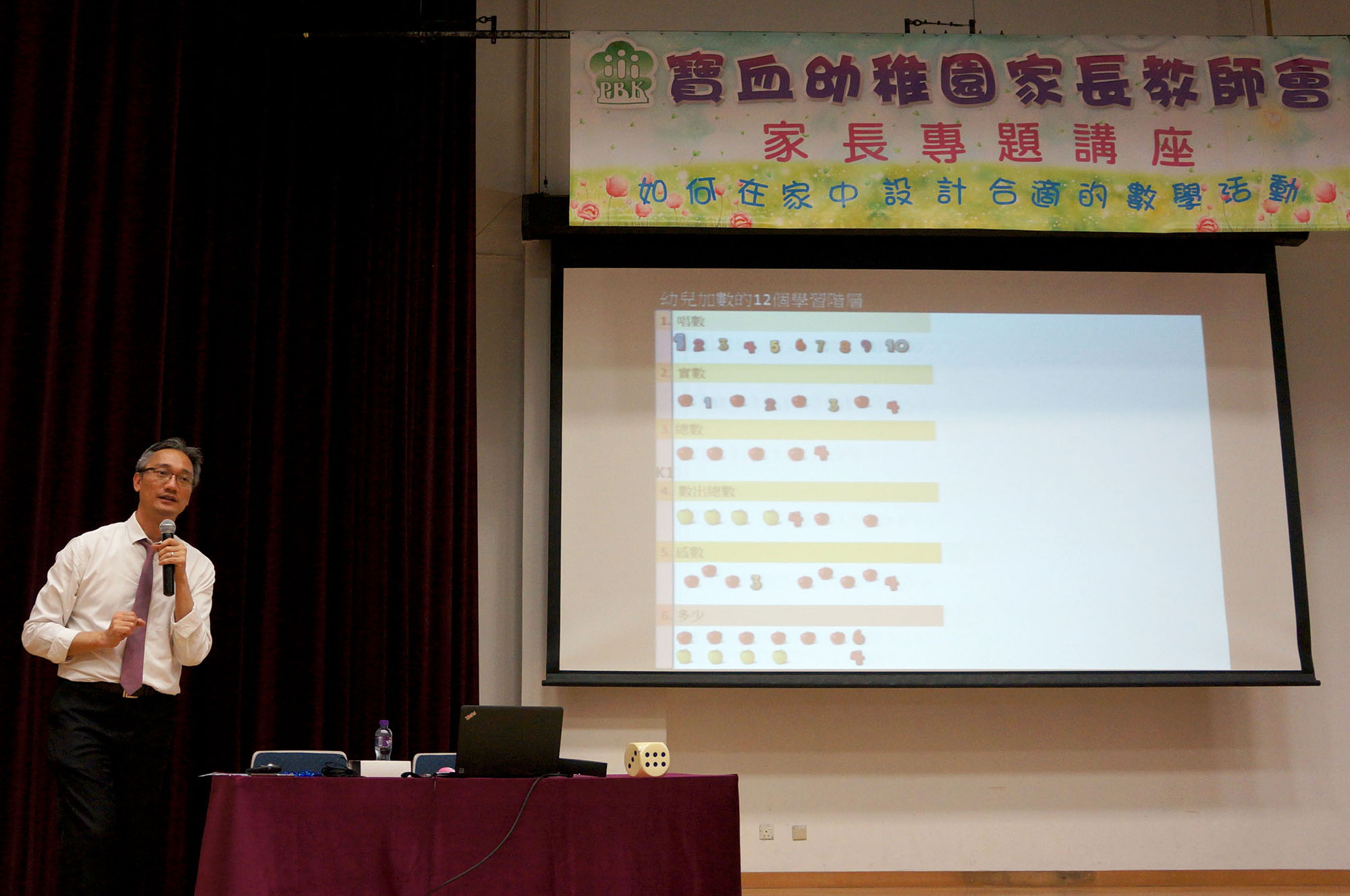 2018年5月17日(四)晚上,本園家長教師會邀請到洪進華先生(香港浸會大學教育學系高級講師、《幼兒數學新思維》作者) ,於禮頓山社區會堂舉辦家長專題講座~「如何在家中設計合適的數學活動」。當晚講座題材吸引,約180多位家長出席。洪Sir講解風趣,引用實際生活例子,簡單的教材與家長一同玩數學遊戲;藉此能幫助父母在家中與孩子進行具啟發性的數學活動。