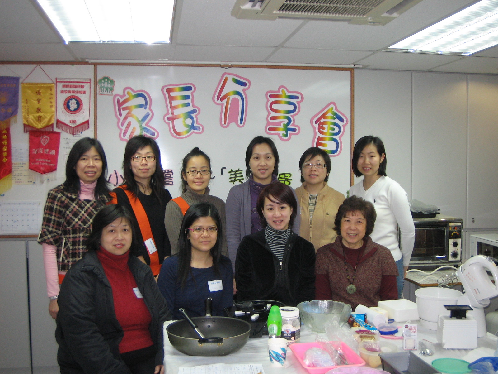2007年5月12日(星期六)上午家長教師會舉辦「家長分享會」,邀請了幼兒智班張耀祖家長分享製作小食---「麵包布丁」。經過張太示範製作過程及講解後,家長們便分組開始嘗試自己動手做---撕麵包、塗牛油、攪伴雞蛋、過濾蛋加鮮奶及糖等,最後放入焗爐。大家互相交流意見,看來簡單的「麵包布丁」,也需要很多學問和技巧,才可以製成香甜美味的布丁。哇!「叮」的一聲,香噴噴、熱騰騰的「麵包布丁」做好了,大家快來試一試。