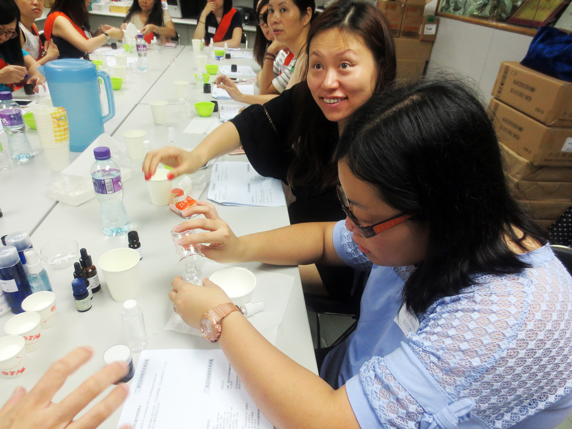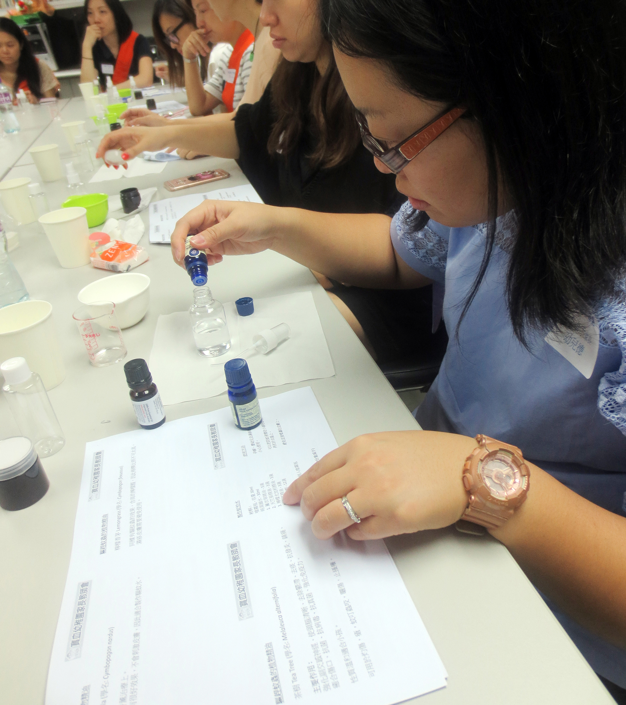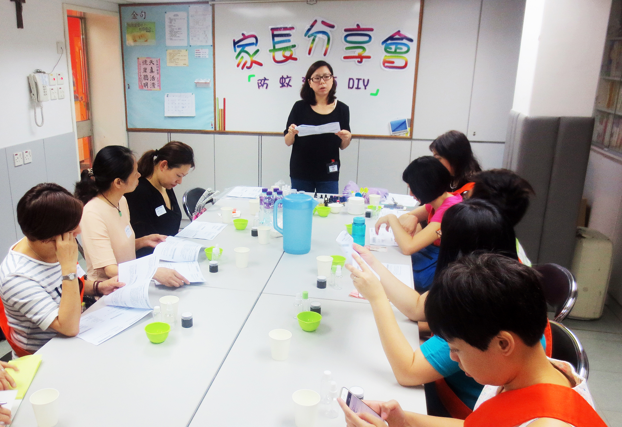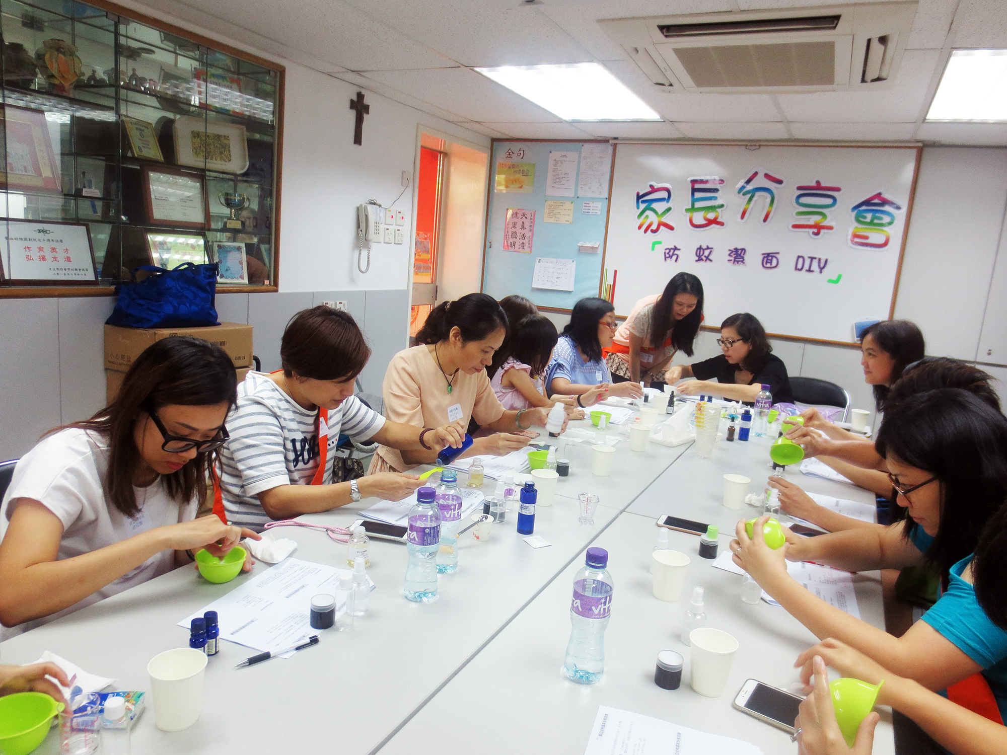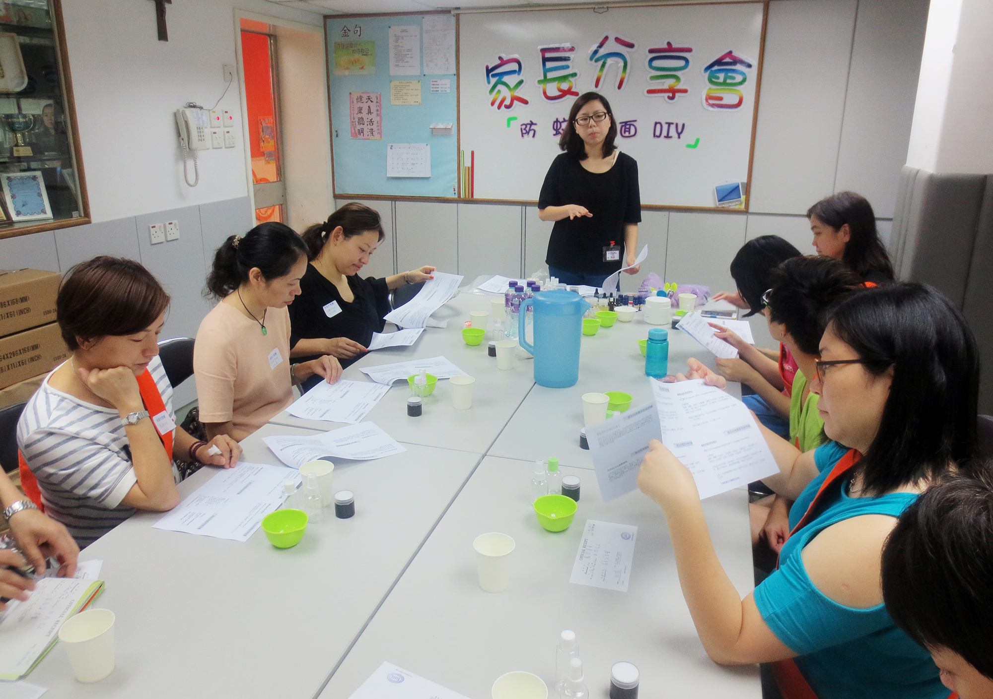 2016年6月25日(星期六)舉行了「家長分享會~(防蚊、潔面DIY)」,參加者非常踴躍,我們邀請了低班仁學生陳柏穎的媽媽-詹翠華女士教授製作防蚊及潔面用品的技巧。首先是簡短講解理論及材料份量,然後示範製作的技巧;接着各位家長便開始分工合作地動手做,過程十分順利,最後完成了製成品包括:驅蚊水、蚊膏及茶樹油薰衣草潔面啫喱。家長們感到非常實用,亦可為小朋友在夏日防蚊作好準備。這次的分享會令大家歡渡了一個愉快的上午。