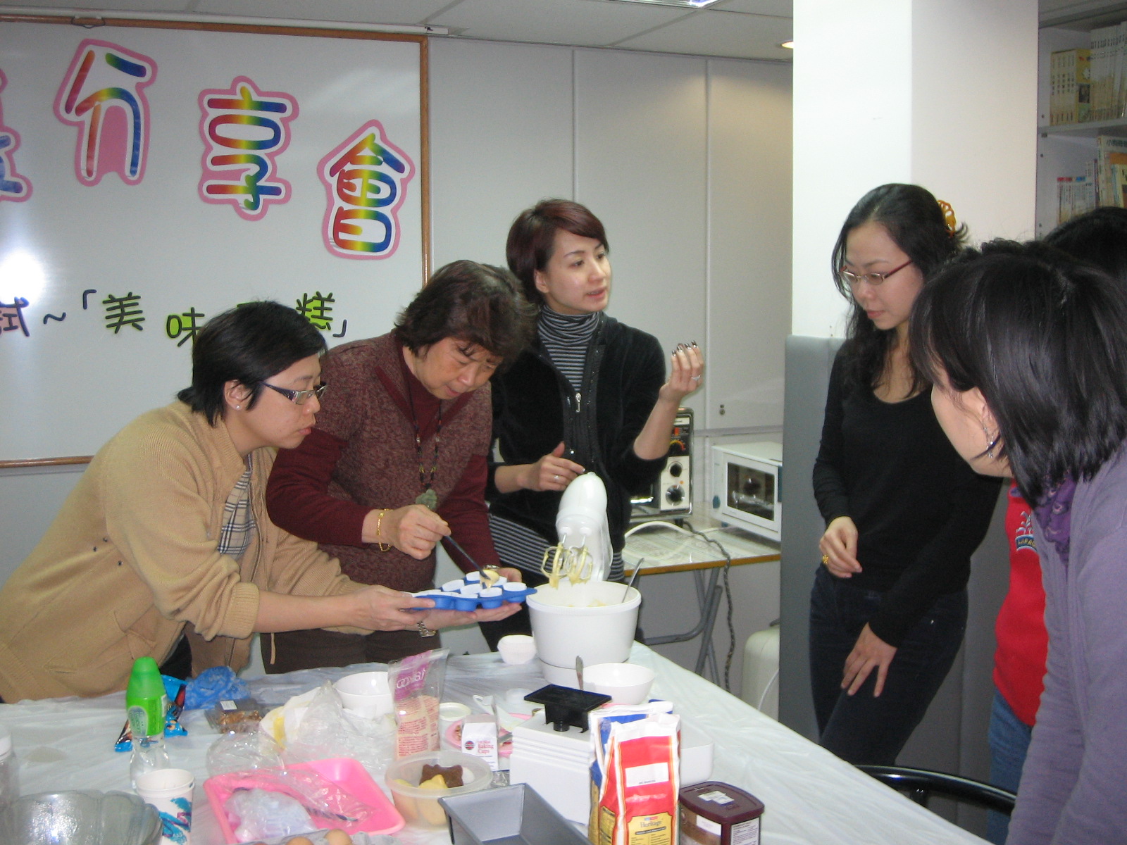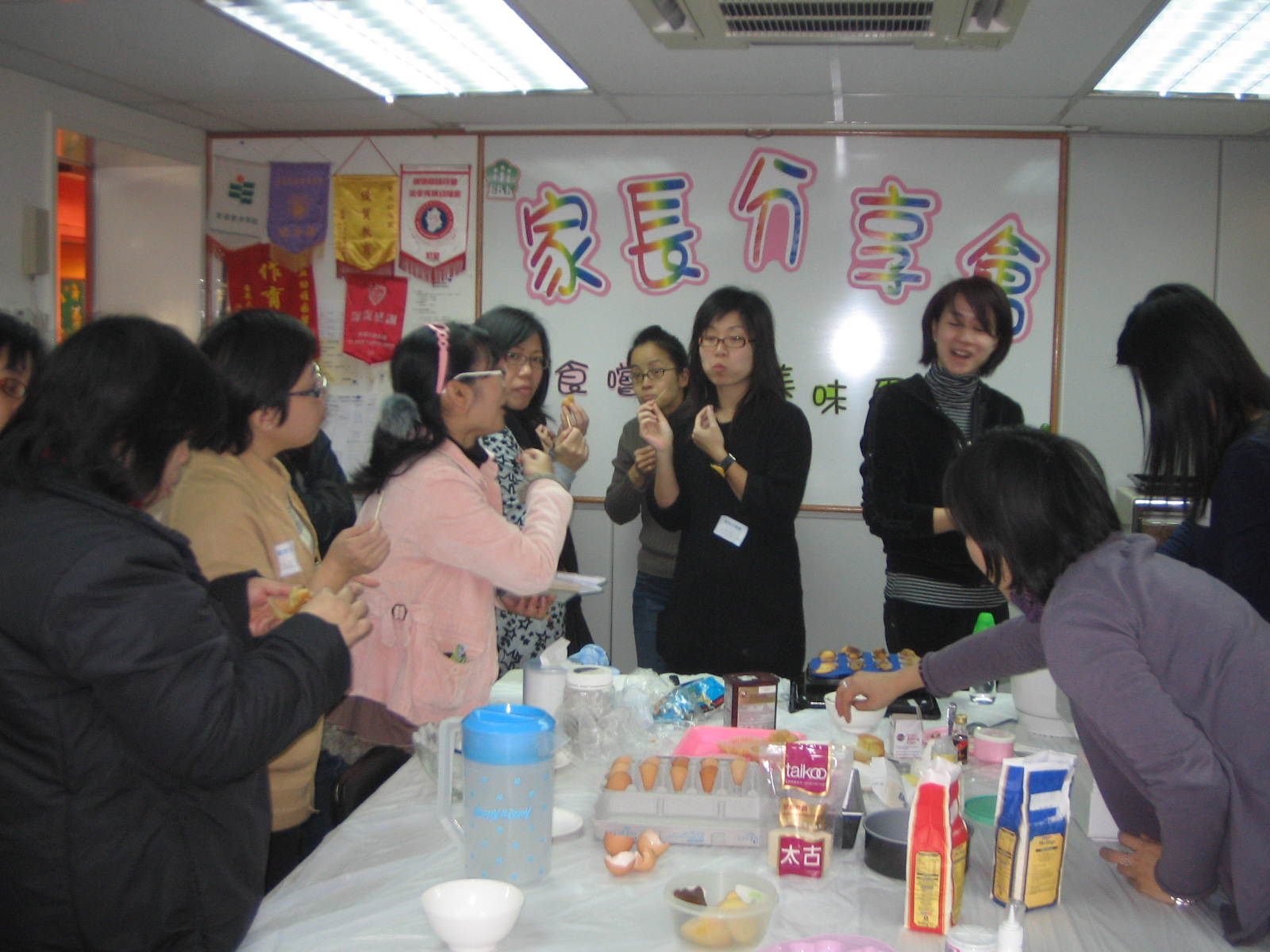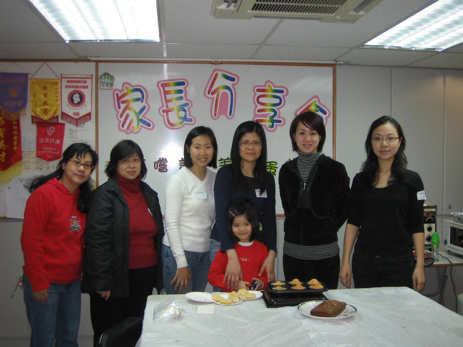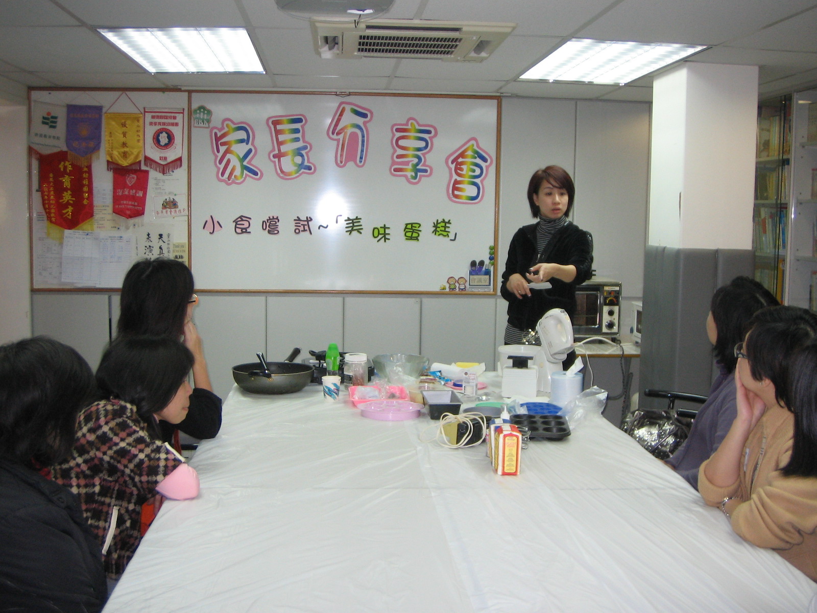 2008年3月1日(星期六)上午,家長教師會舉辦「家長分享會」,邀請了高班孝蔡鈺怡家長分享製作小食---「美味蛋糕」。當日出席的家長非常興奮,積極投入學習。經過蔡太詳細示範後,大家便開始動手做----牛油和沙糖先攪伴,再加入雞蛋和麵粉等混合一起攪伴,蛋漿製成後,可隨意加入果仁、提子乾或朱古力豆……,最後放入焗爐。看來簡單的「蛋糕」,也需要很巧和心思,才可以製成香甜美味的蛋糕。「叮」的一聲!香噴噴、熱騰騰的「蛋糕」焗好了,快來嚐一嚐!