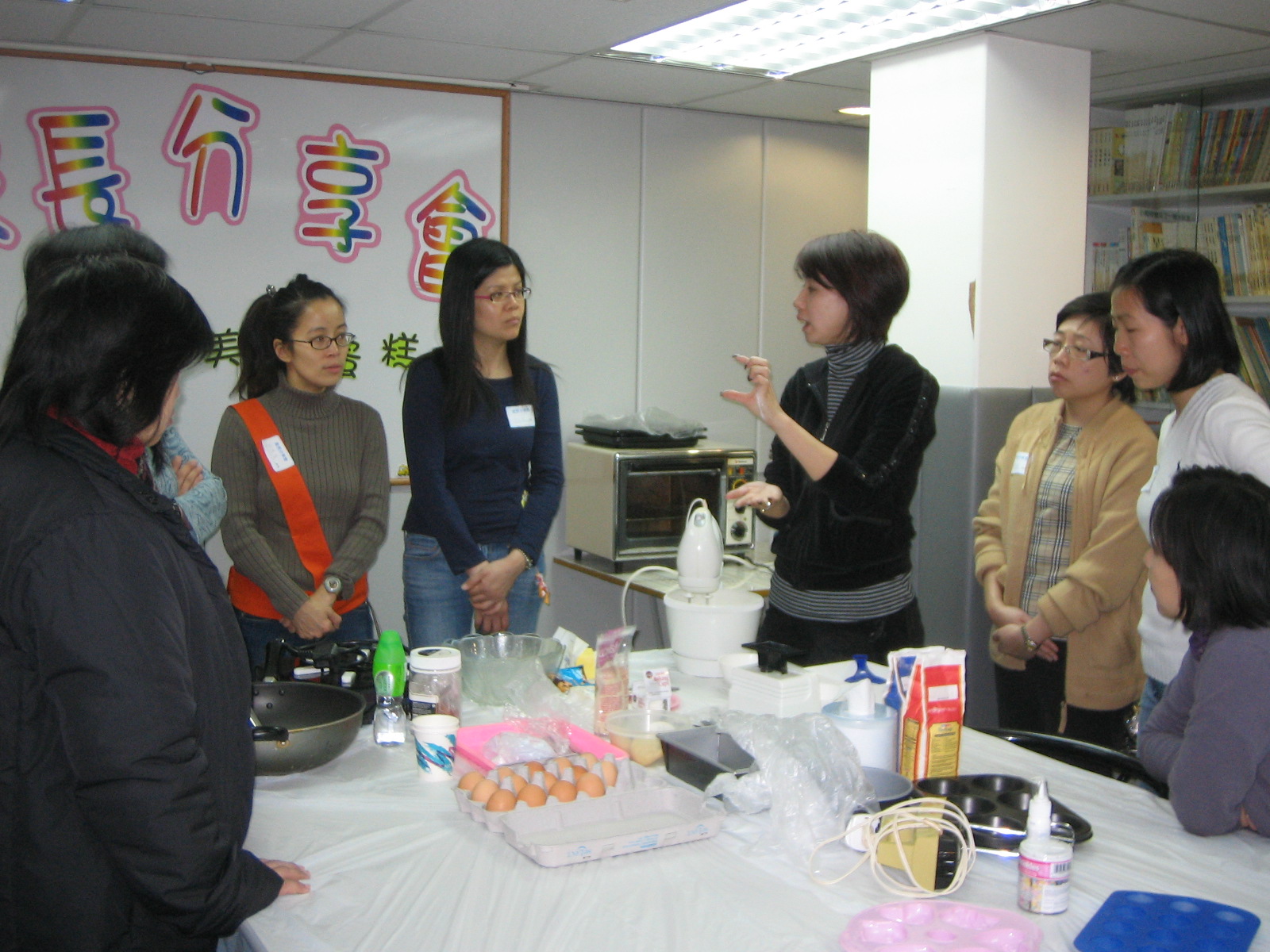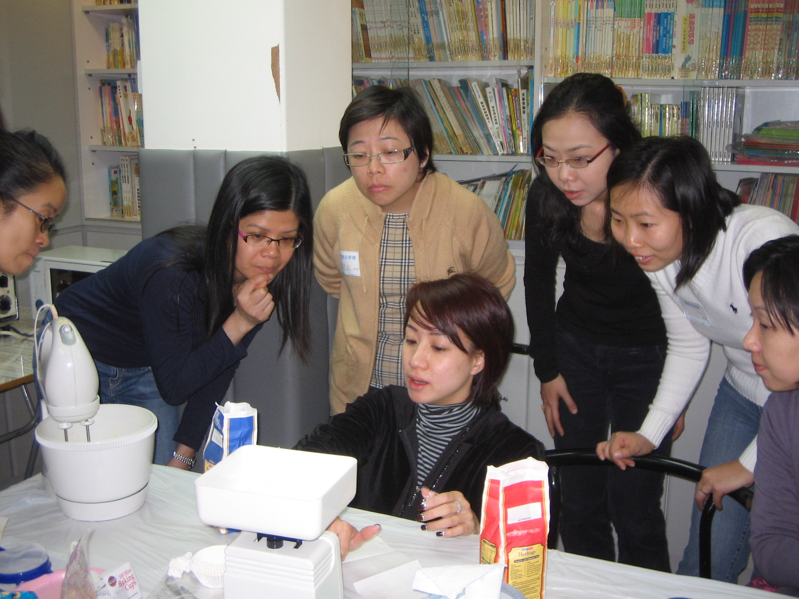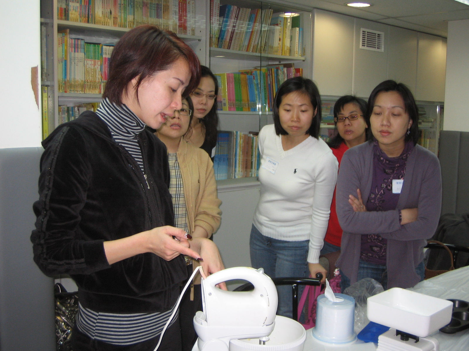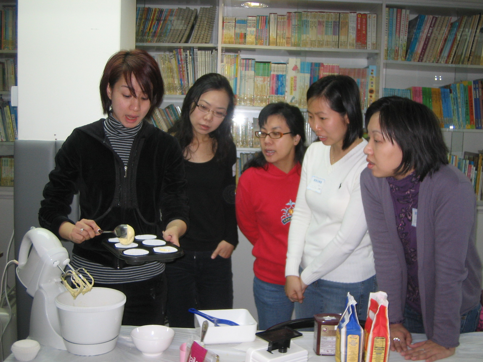 2008年3月1日(星期六)上午,家長教師會舉辦「家長分享會」,邀請了高班孝蔡鈺怡家長分享製作小食---「美味蛋糕」。當日出席的家長非常興奮,積極投入學習。經過蔡太詳細示範後,大家便開始動手做----牛油和沙糖先攪伴,再加入雞蛋和麵粉等混合一起攪伴,蛋漿製成後,可隨意加入果仁、提子乾或朱古力豆……,最後放入焗爐。看來簡單的「蛋糕」,也需要很巧和心思,才可以製成香甜美味的蛋糕。「叮」的一聲!香噴噴、熱騰騰的「蛋糕」焗好了,快來嚐一嚐!